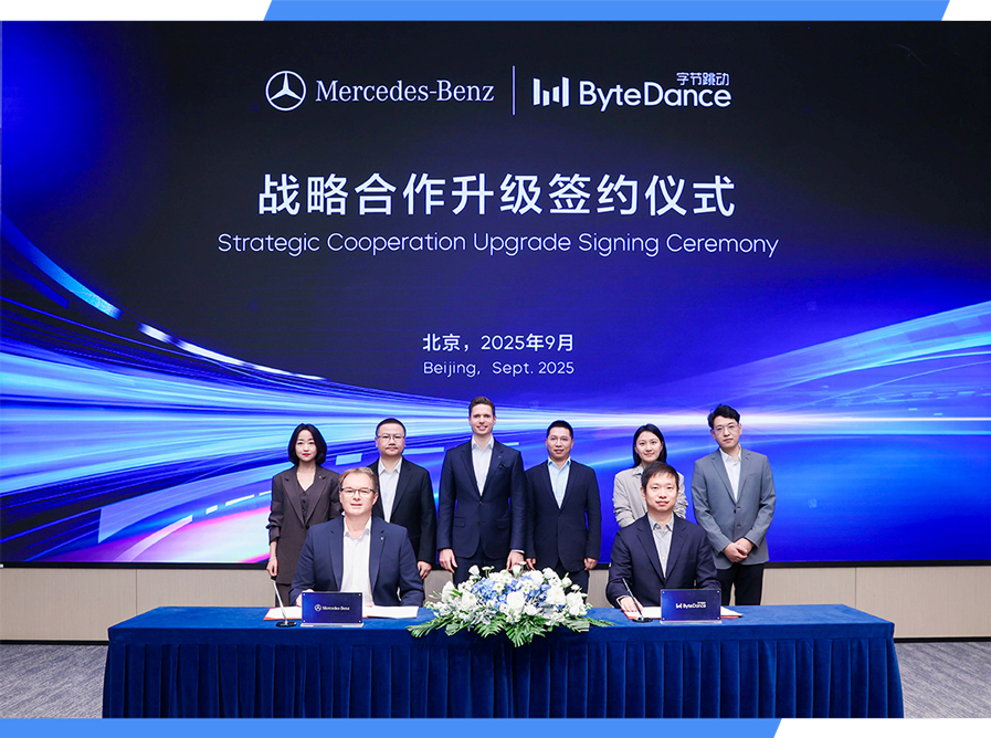 9月23日,奔驰与北京字跳网络技术有限公司宣布签署升级战略合作备忘录,旨在进一步提升提速AI技术的深度融合及创新应用。